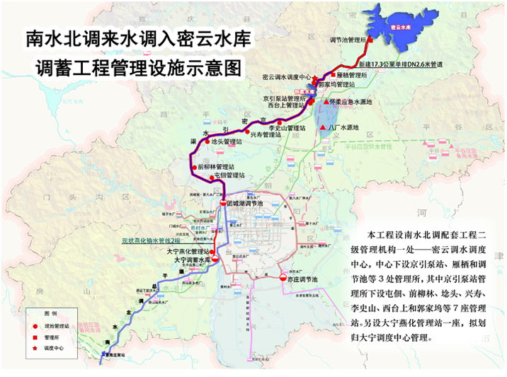 南水北调来水调入密云水库调蓄工程拟从团城湖调节池取水,通过京密引水渠反向输水,分别于屯佃闸、柳林倒虹吸、埝头倒虹吸、兴寿倒虹吸、史山节制闸和西台上跌水节制闸新建 6 级泵站提升输水至怀柔水库,再由怀柔水库进水闸旁新建的郭家坞泵站提升输水至北台上倒虹吸处,经新建雁栖泵站加压后,由新建的京密引水渠侧直径 2.6 米的 PCCP 输水管道输入白河电站下游调节池,再由新建溪翁庄泵站加压后将来水送入密云水库。工程线路总长 103 公里,总扬程 149.3 米。工程调水最大流量 20 立方米 / 秒,其中团城湖至怀柔水库段流量 20 立方米 / 秒,怀柔水库至密云水库段流量 10 立方米 / 秒。
